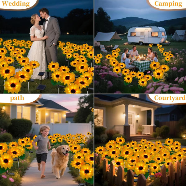 Lampile solare impermeabile pentru gradina, cu multe LED-uri in jurul fiecarei petale, fac aceste decoratiuni de exterior cu floarea-soarelui foarte luminoase noaptea, creand o atmosfera calda si luminoasa, in timp ce arata grozav chiar si in zilele innorate sau iarna mohorata. Un plus frumos pentru curte, poate insenina gradina cu flori, poate fi amplasat langa rulota de camping, decor de toamna in aer liber, decoratiuni funerare etc.